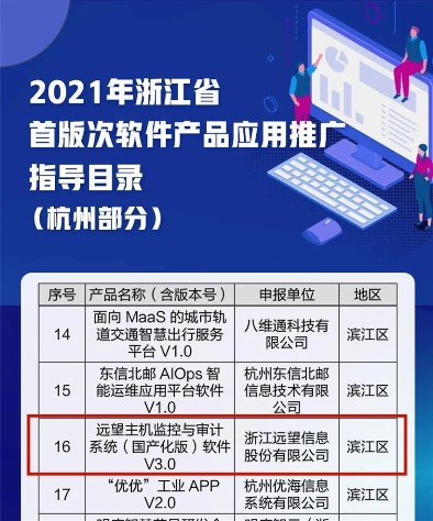 12月13日,浙江省經(jīng)信廳正式公布《2021年浙江省首版次軟件產(chǎn)品應用推廣指導目錄》,經(jīng)相關(guān)部門(mén)層層推薦及權威專(zhuān)家嚴格遴選,遠望主機監控與審計系統成功入選。這也是繼2020遠望網(wǎng)絡(luò )安全管理支撐平臺入選以來(lái),遠望信息再獲認定。