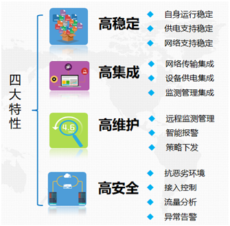 系統主要由室外電子設備箱、前端管理主機、前端主機管理平臺三部分組成。具備高穩定、高集成、高維護、高安全等四大特性。