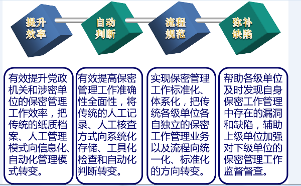 遠望保密自查自評估工作管理系統的部署,將為保密管理工作帶來(lái)三種轉變:一是信息化、自動(dòng)化轉變:由傳統紙質(zhì)化記錄、審核的人工管理模式向信息化管理、自動(dòng)化審核轉變。二是標準化、體系化轉變:各級單位各自獨立的保密工作管理業(yè)務(wù)向統一化、標準化管理轉變。三是監督、檢查常態(tài)化轉變:保密監督、檢查工作落到實(shí)處,形成保密監督、檢查的常態(tài)化機制。