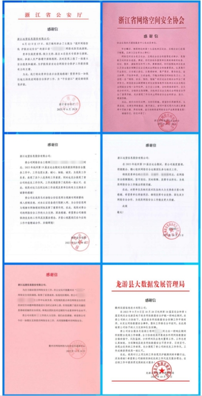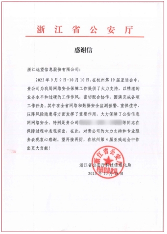 作為數字政府安全防控體系構建的引領(lǐng)者,遠望信息在亞運會(huì )期間精心組織“精兵強將”,積極參與到省內各地政府部門(mén)的網(wǎng)絡(luò )安全保障工作中去,以扎實(shí)的技術(shù)服務(wù)水平、高度的工作責任感與優(yōu)良的工作作風(fēng)出色完成了各項安保工作任務(wù),展現了遠望信息“東道主”網(wǎng)安企業(yè)的責任與擔當,獲得了一大波來(lái)自政府部門(mén)及相關(guān)機構的一致贊譽(yù)與衷心感謝,感謝信如雪花般紛至杳來(lái):浙江省公安廳、杭州市公安局、衢州市公安局、桐廬縣公安局、余杭區公安局、龍游縣大數據局、浙江省網(wǎng)絡(luò )空間安全協(xié)會(huì )……