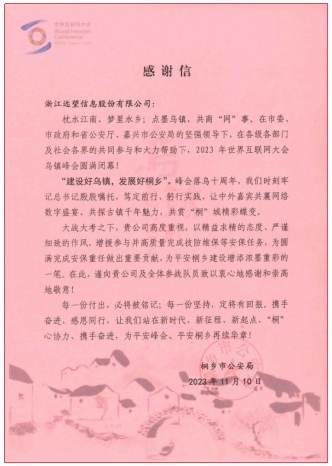 同時(shí),在剛落幕不久的2023年(烏鎮)世界互聯(lián)網(wǎng)大會(huì )上,遠望信息同樣以精益求精的工作態(tài)度和嚴謹細致的工作作風(fēng)圓滿(mǎn)完成了大會(huì )網(wǎng)絡(luò )安保任務(wù),收獲了來(lái)自桐鄉市公安局的感謝信。