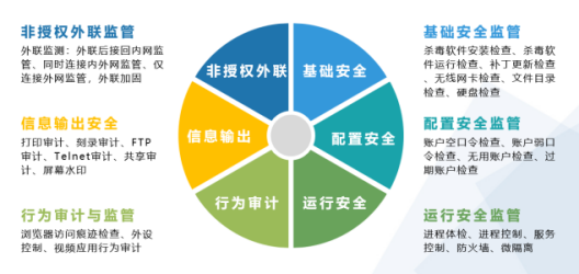 遠望主機監控與審計產(chǎn)品以安全管控為核心、以實(shí)時(shí)監測為支撐,從基礎安全、運行安全、安全檢查、行為安全四個(gè)方面確保終端主機安全,構建有效監控非授權違規外聯(lián)、違規軟硬件安裝、殺毒軟件安裝、外部設備使用的全方位主機安全解決方案,助力政企單位對內部主機實(shí)時(shí)監測與檢查,形成日?;O測機制。