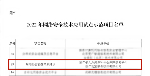 作為浙江省委網(wǎng)信辦試點(diǎn)項目,浙江省人力資源和社會(huì )保障專(zhuān)網(wǎng)安全管控體系建設項目此前曾榮獲浙江省網(wǎng)絡(luò )安全優(yōu)秀案例獎、全國信安標委網(wǎng)絡(luò )安全國家標準優(yōu)秀實(shí)踐案例三等獎等榮譽(yù)。